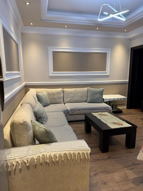 Seahaven Apartment in Saranda offers a spacious layout with two bedrooms, two bathrooms, and a comfortable living room. The apartment includes a fully equipped kitchen with modern appliances, a washing machine, and a dining area.